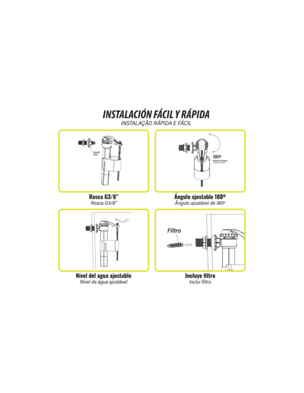 Rácor latón 3/8”Presión 0.2-10 BARPicos máximos de 21 BARResistente al deterioroBoya con sistema de protecciónBoya regulable en altura, permite ajustar el nivel del aguaModelo UNIVERSALApto para cisternas de tanque bajoLlenado rápido y silencioso