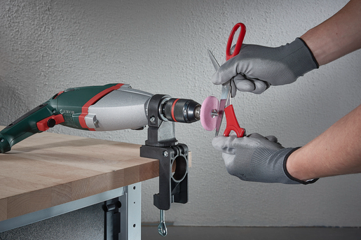Sujeción conforme con la norma europea, para taladros alimentados por la red eléctrica con un diámetro de cuello de 43°mmGiro horizontal de 360° y ajuste vertical a 0° y 90°De robusto plástico reforzado con fibra de vidrio