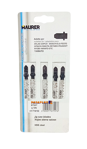 FICHA TÉCNICAHoja sierra calar maurer madera corte grueso 5 piezas- Validas para todas las sierras excepto black&decker.- Hoja para cortes bastos y rápidos.- Largo hoja dentada: 75 mm.- Dientes por pulgada: 6.- Grosor hoja: 1.3 mm.- Capacidad de corte:> madera blanda: 60.0 mm> madera dura: 60.0 mm.- Articulo conocido como hoja sierra caladora, hoja sierra vaiven.