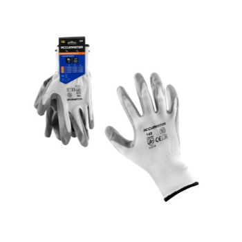 Guantes de protección fabricados en poliéster de 13 galgas con recubrimiento liso de nitrilo blanco en la palma, diseñados para trabajos generales de manipulación donde se requiere buen agarre, resistencia mecánica media y alta sensibilidad táctil. Adecuados para logística, almacén, mantenimiento ligero y tareas de montaje.